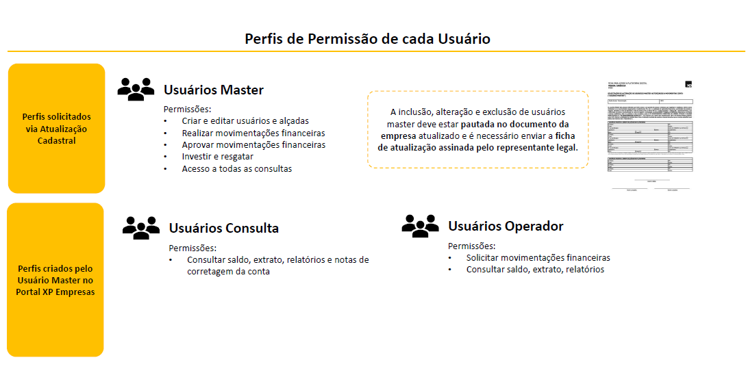 Para o cadastro dos acessos secundários, apenas o cliente com o acesso master pode fazer via portal XP Empresas, conforme o passo a passo abaixo: